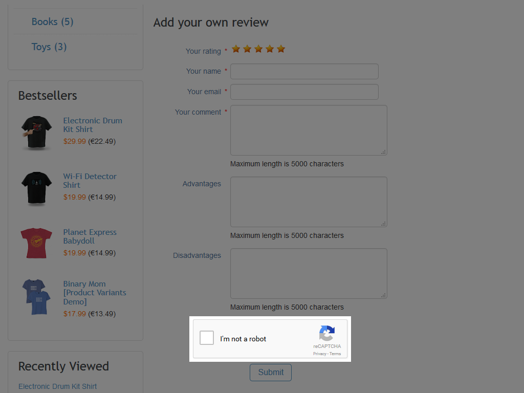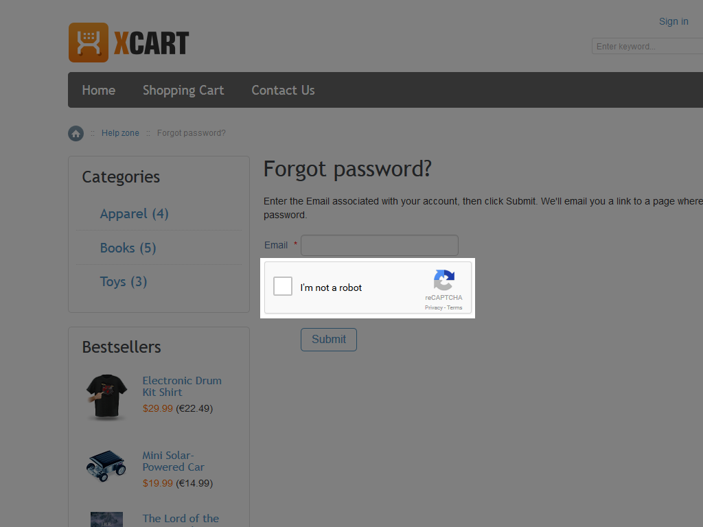 This add-on provides advanced protection from bots for your store. Gives access for real customers without any difficulties. It protects your store from robots and spam. There is no need to identify some symbols and enter them into text field, just one click and a customer can move forward.