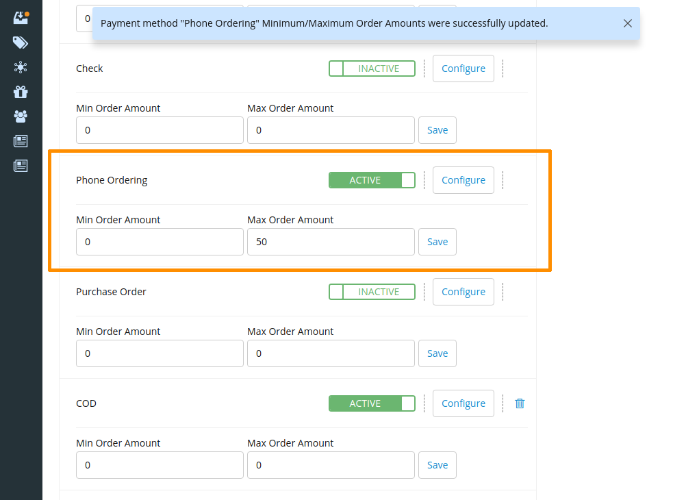 • Set min/max order amounts per payment method.
