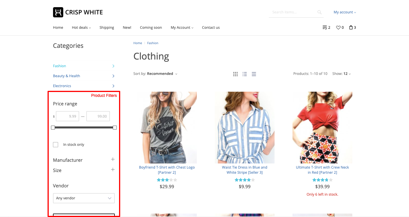 If the filter is enabled for a given category, the panel appears in the left side menu. When any filter is changed, the 'Show products' button appears next to it. Thus the customer initiates the filter application and the page is being refreshed, so that to display the filtered results only.