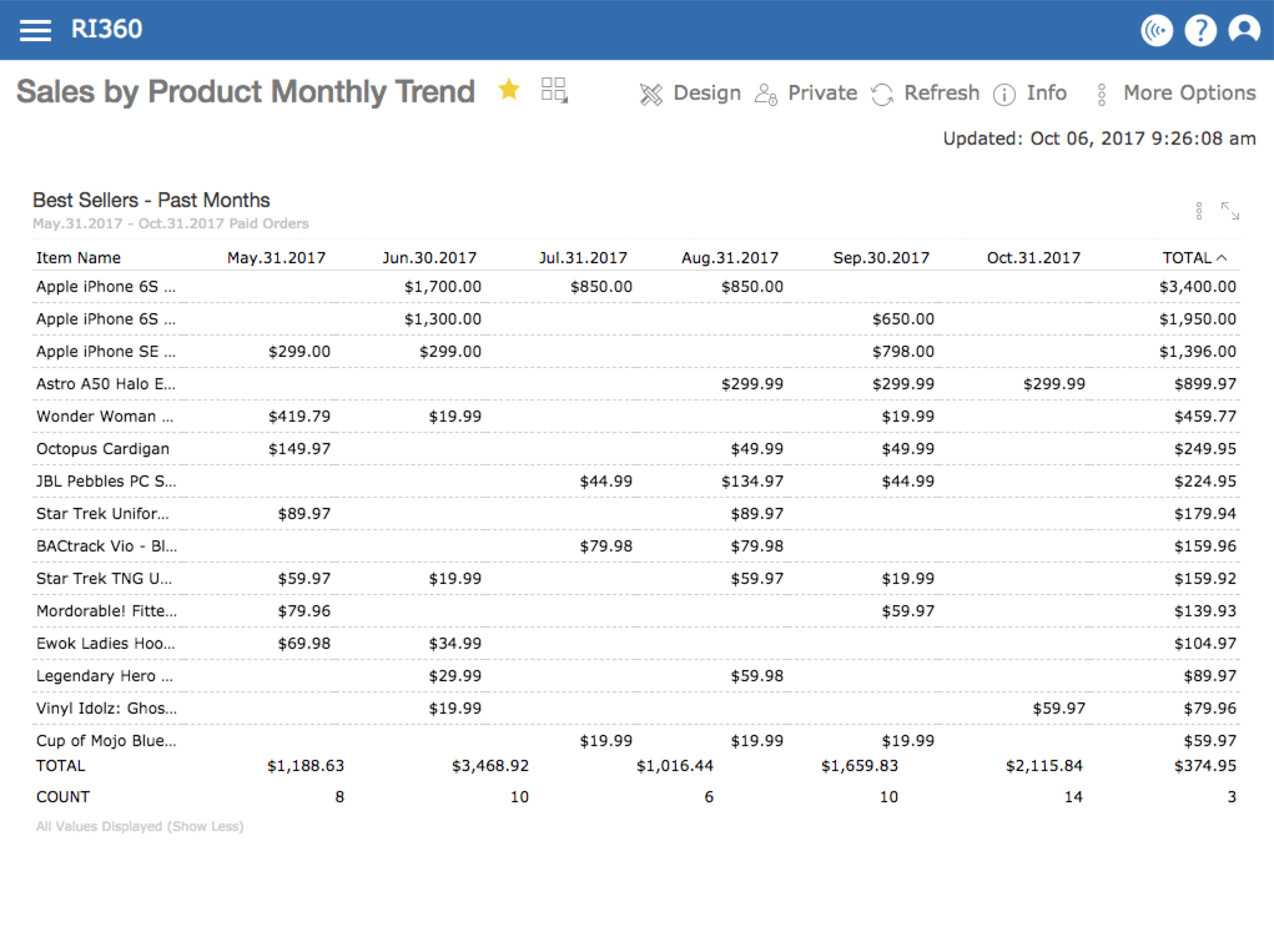- Daily morning emails to let you know if this month's sales are better than previous months and provide a full inventory management summary. (If you want different or additional information in your morning emails from Ri360, just let us know and we can easily make your changes for you.)