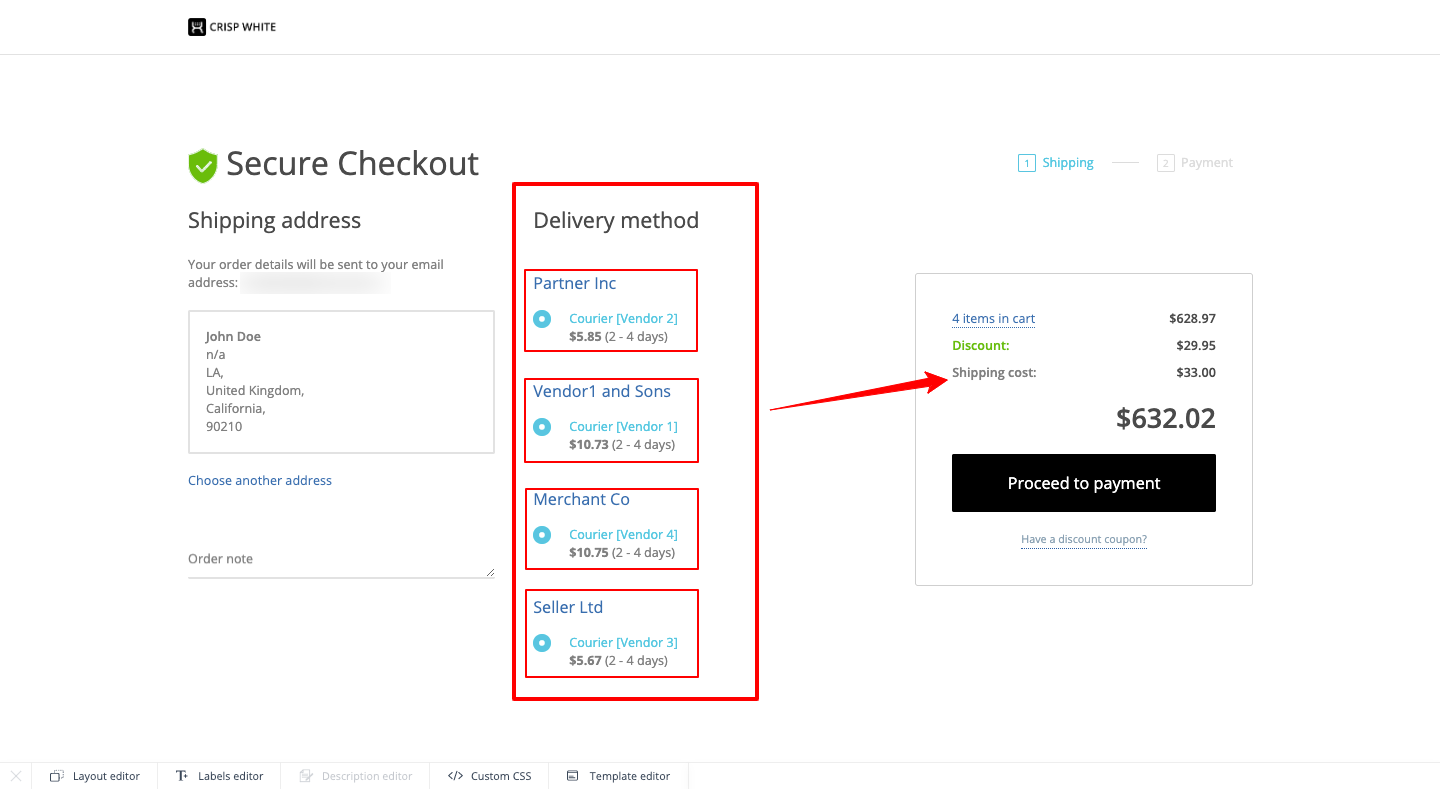 - In Vendors as separate shops mode, the vendors should specify their own ship-from address and setup shipping methods. As a result, if the cart contains the goods from several vendors, these products will be grouped by vendor, and the customer will need to select a shipping method for each group separately - and only after that proceed with payment. After payment, several orders will be created, with the vendors seeing the orders, containing their goods only. In this mode, the vendors can manage their order: edit, change statuses, add tracking info.