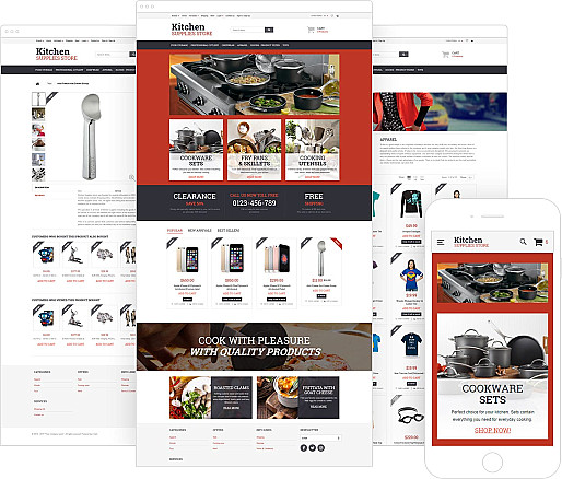 The Kitchen Supplies Store design template is good for stores selling accessories, kitchen supplies & furniture. It's bright and looks stylish and professional due to red and black colors combination.